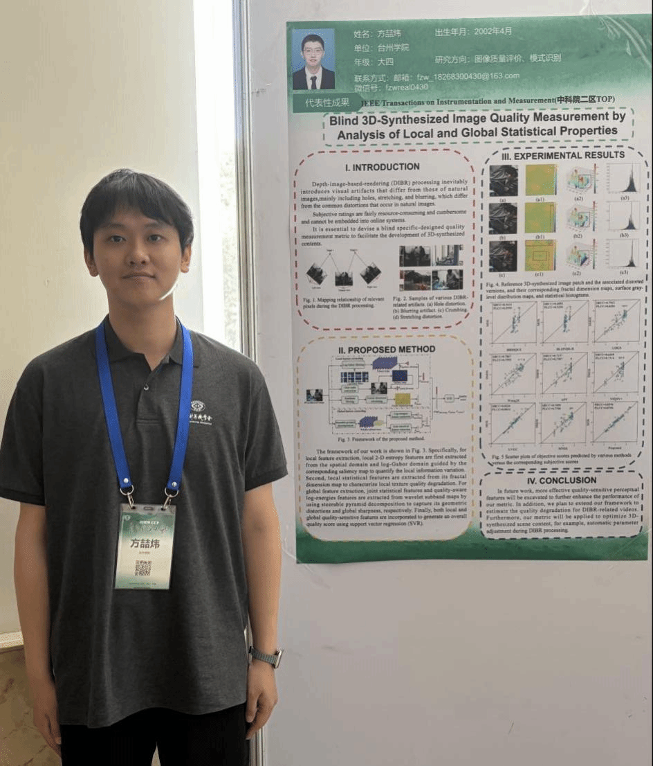 据悉,学术秀环节由来自CCF全国各地的40余名参赛选手进行学术秀展示、演讲。经过了数个小时的精彩展示和评委组独立打分评审,分别确定了博士生组、硕士生组、本科生组的评比结果,每组分别产生一等奖1名,二等奖2名。我校维多利亚老品牌vic1192020级大数据专业本科生方喆炜同学在学术秀中展示并演讲了题为“Blind 3D-Synthesized Image Quality Measurement by Analysis of Local and Global Statistical Properties”的最新研究成果,该成果发表在国际TOP期刊《IEEE Transactions on Instrumentation and Measurement》,指导教师和通讯作者为崔跃利博士。最终,在“大学生学术秀”中获得本科组二等奖,展现了台院学子的风采,获得专家和评委们的一致好评。据悉,这是国内获奖的唯一非“985”、“211”、“双一流”高校,浙江省内唯一获奖高校,为学校赢得了良好的声誉。